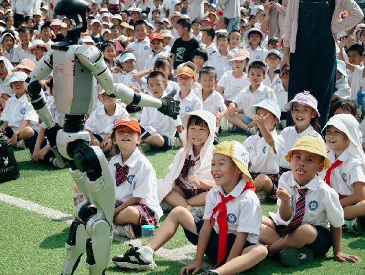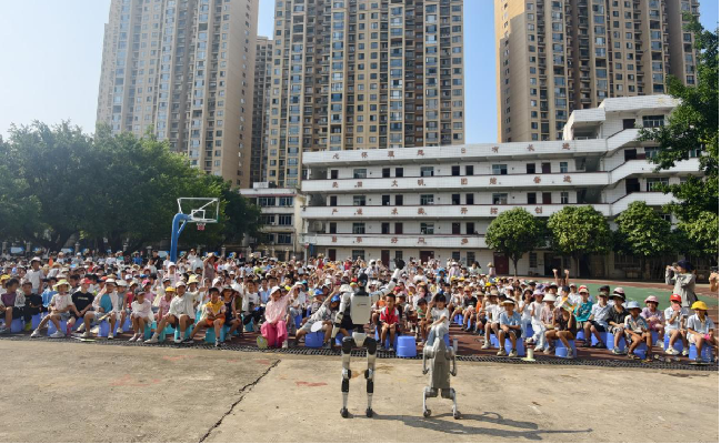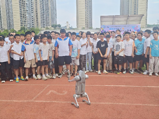 活动现场,智能机器人与仿生机器狗的动态展示成为焦点。在鹿寨县城中小学、鹿寨县城南第二小学操场,搭载AI视觉系统的巡检机器人精准完成路径规划任务,灵活避开障碍物;机器人则通过打招呼、握手等动作与同学们互动。仿生机器狗的表演更令人惊叹——它不仅能完成跳跃、翻滚等高难度动作,还能通过动作捕捉技术模仿学生的指令动作,引得现场欢呼声此起彼伏。科技辅导员现场拆解机器狗的关节结构,揭示伺服电机与陀螺仪的协同工作原理,让学生们直观感受到机械工程与人工智能的融合魅力。