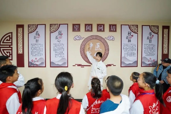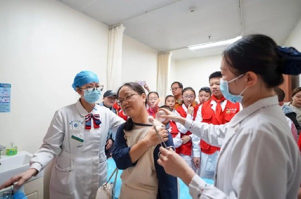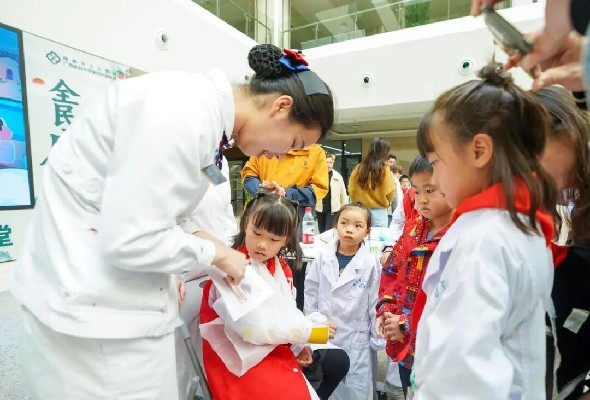 沉浸式参观第二站,大家来到了弥漫着淡淡中草药香的中医科。“有谁知道中医的起源从哪里开始?又是谁提出了‘望闻问切’呀?”面对好奇的孩子们,中医科副主任医师张婷用生动活泼的语言普及了中医历史文化,让孩子们对中医知识有了初步的了解。随后,孩子们化身“小小中医师”,前往治疗室分别了解三伏贴、拔罐、艾灸等中医常见外治方法。在中医师的指导下,孩子们还体验了耳穴压豆,现场收获满满。