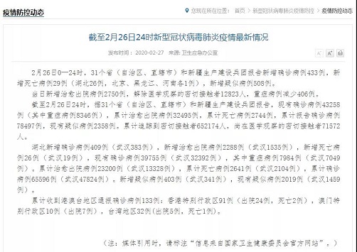 截至2月26日24时,据31个省(自治区、直辖市)和新疆生产建设兵团报告,现有确诊病例43258例(其中重症病例8346例),累计治愈出院病例32495例,累计死亡病例2744例,累计报告确诊病例78497例,现有疑似病例2358例。累计追踪到密切接触者652174人,尚在医学观察的密切接触者71572人。